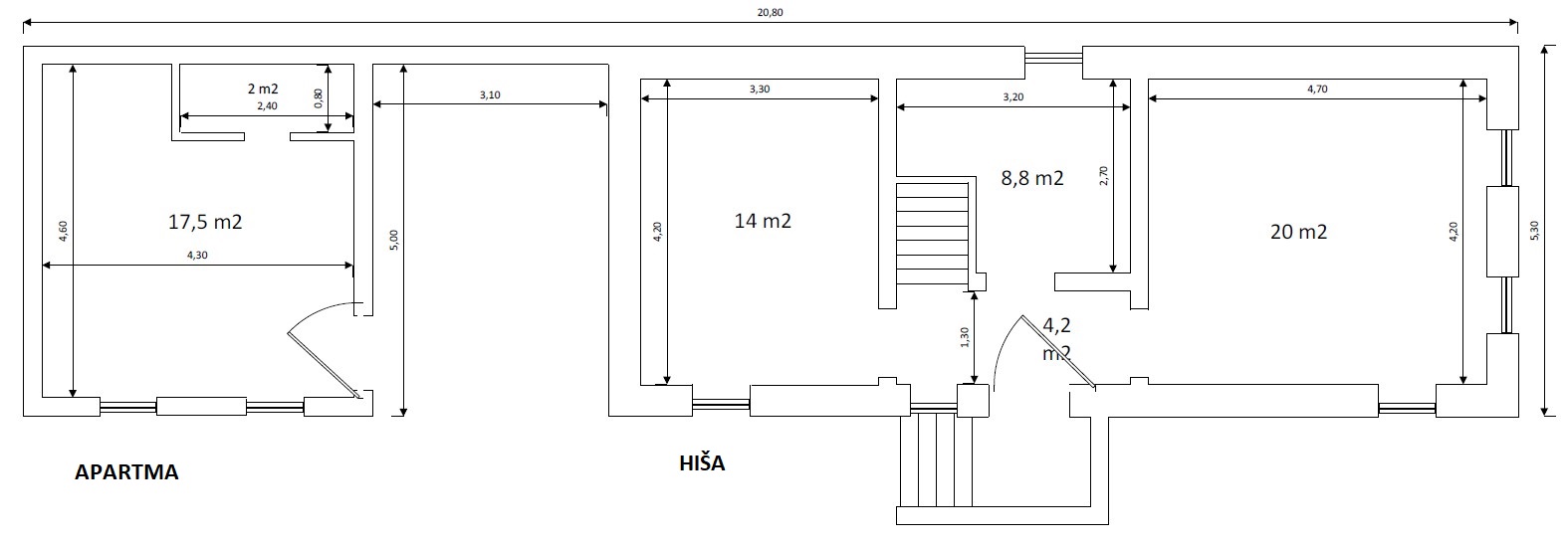 - hiša je sestavljena iz dveh delov in sicer dela, ki smo ga poimenovali »HIŠA« in dela, ki smo ga poimenovali »APARTMA / PISARNA«>
